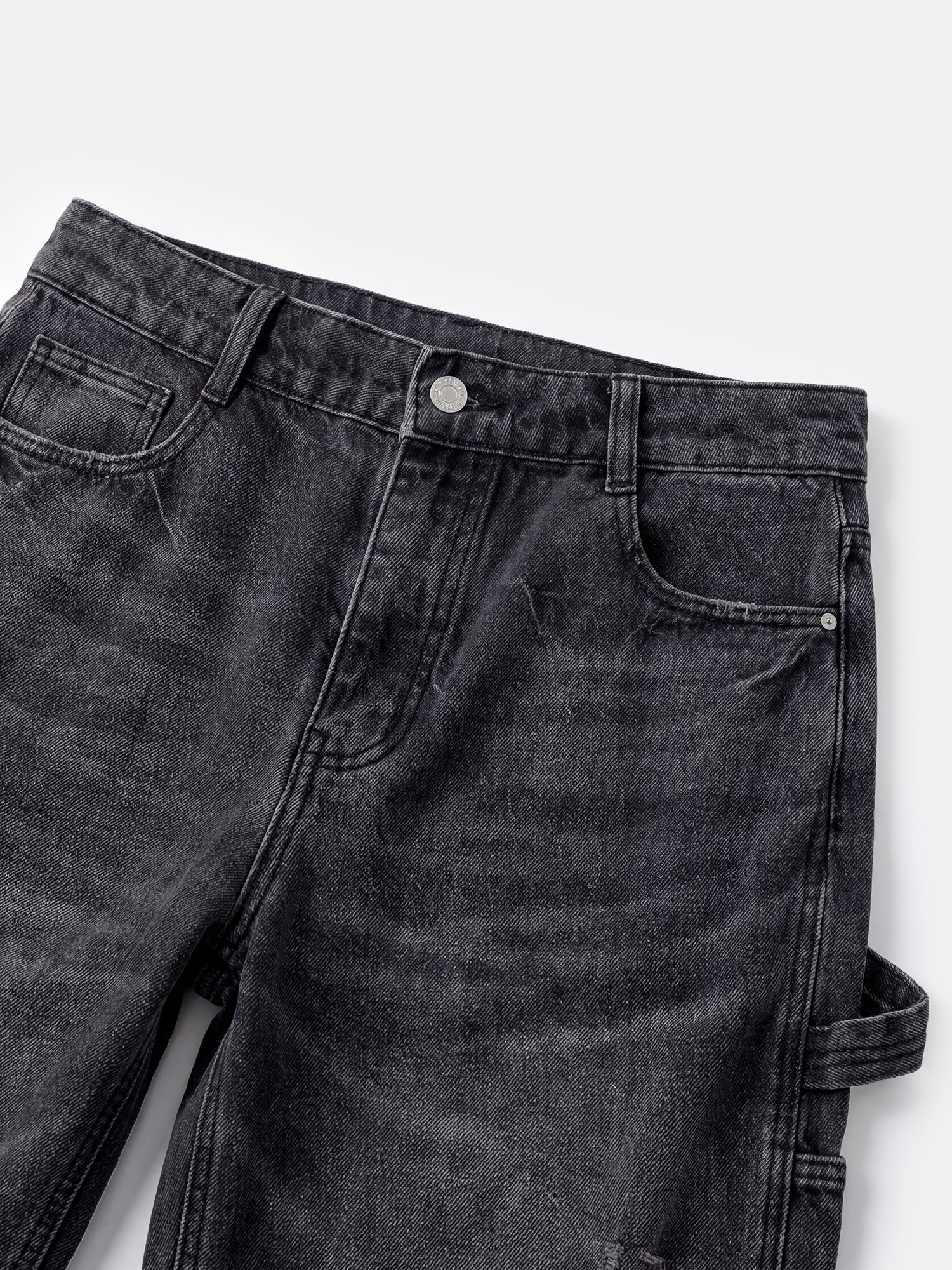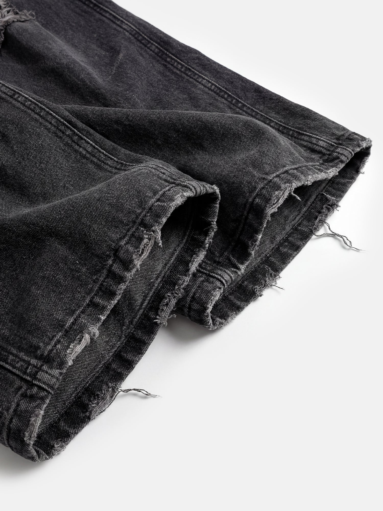 Denim s uhlíkovým praním, drsnými roztrženími na kolenou a vrstvenými lemy, které se přehýbají přes tenisky pro snadný, každodenní styl.