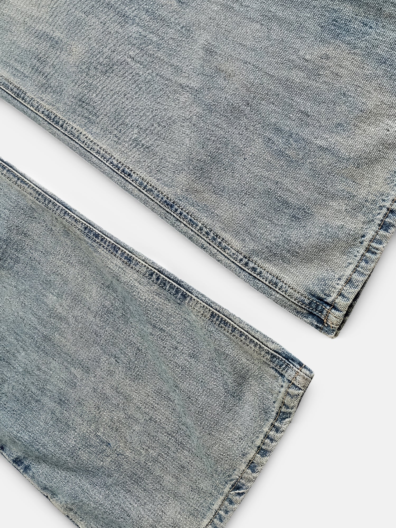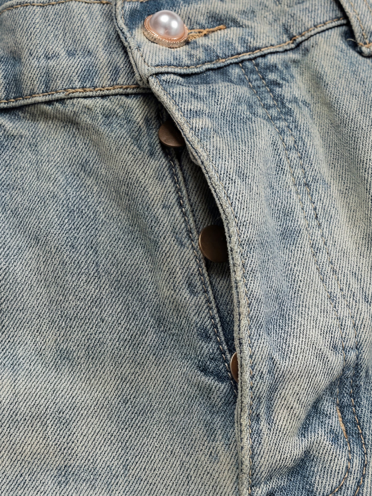 Lehce stonewash denim, volný střih s extra dlouhým vnitřním švem pro vrstvený efekt. Dokončeno zapínáním na knoflíky a klasickým uspořádáním pěti kapes.