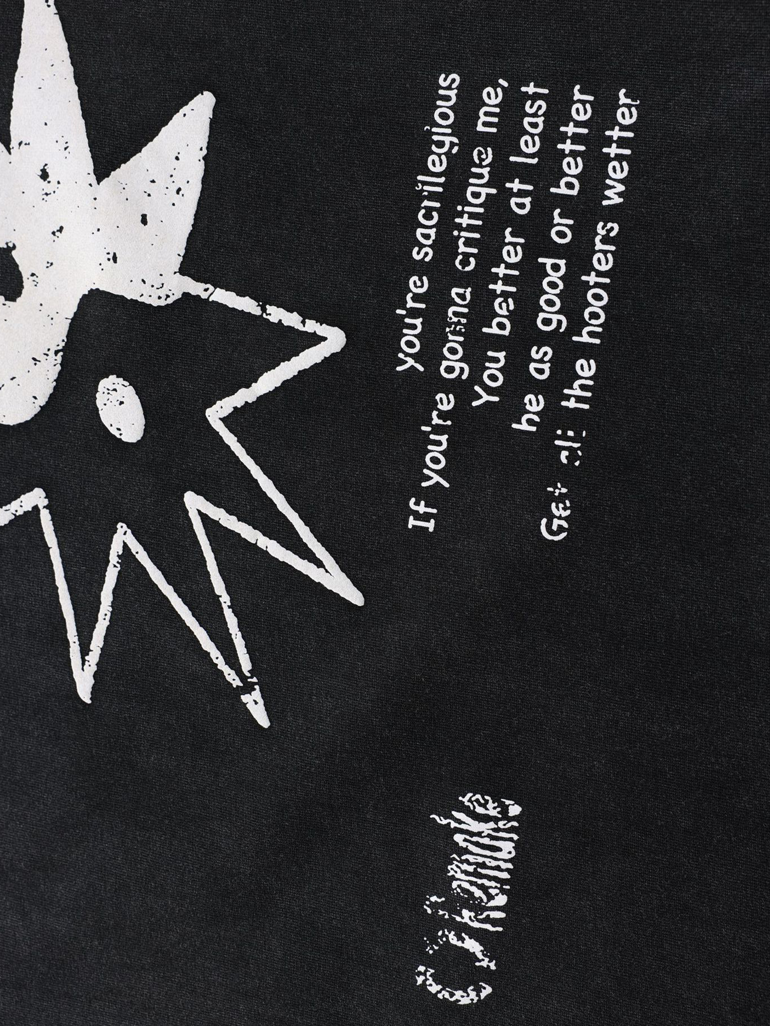 Černé oversized tričko s výraznými bílými grafickými potisky a textem na přední straně. Výrazný kousek s energií inspirovanou ulicí.