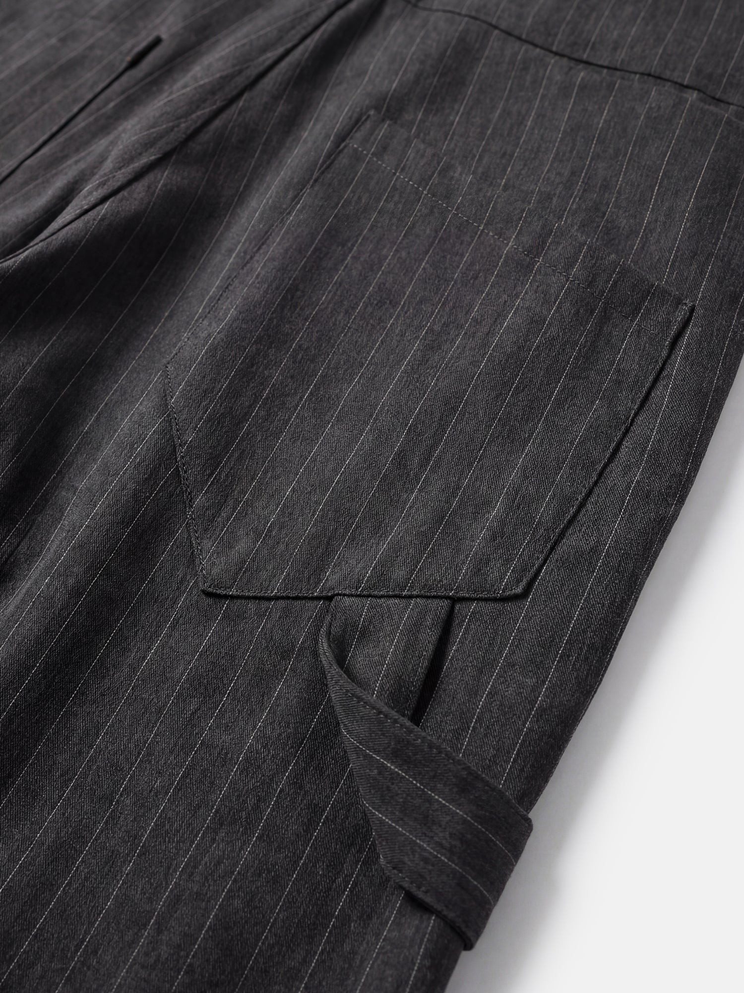 Anthrazitfarbene Nadelstreifenhose mit weitem und langem Schnitt für einen lässigen Fall. Seitliche Schnallen an der Taille verleihen dem schlichten Anzug-Look zusätzliche Funktionalität.