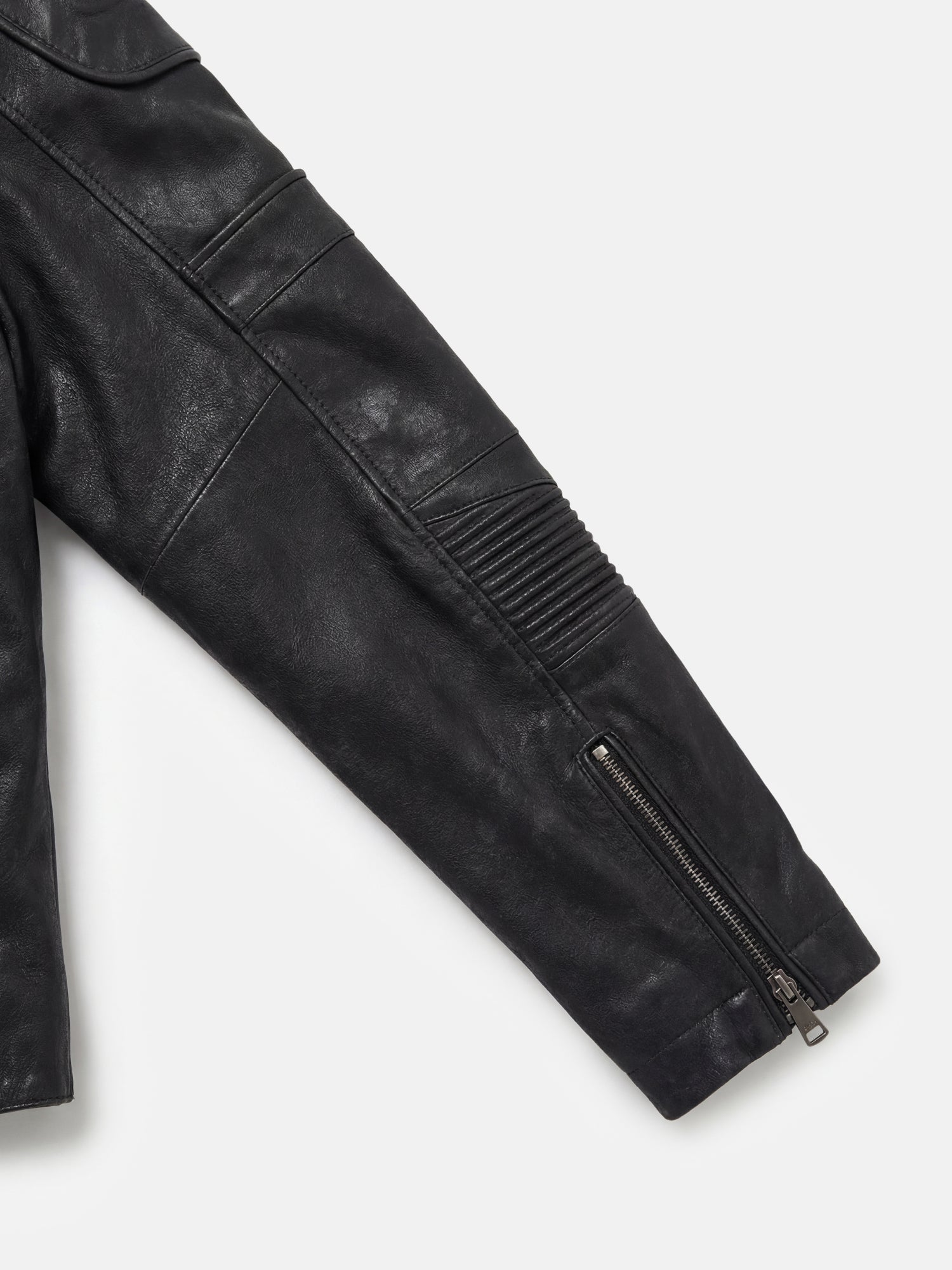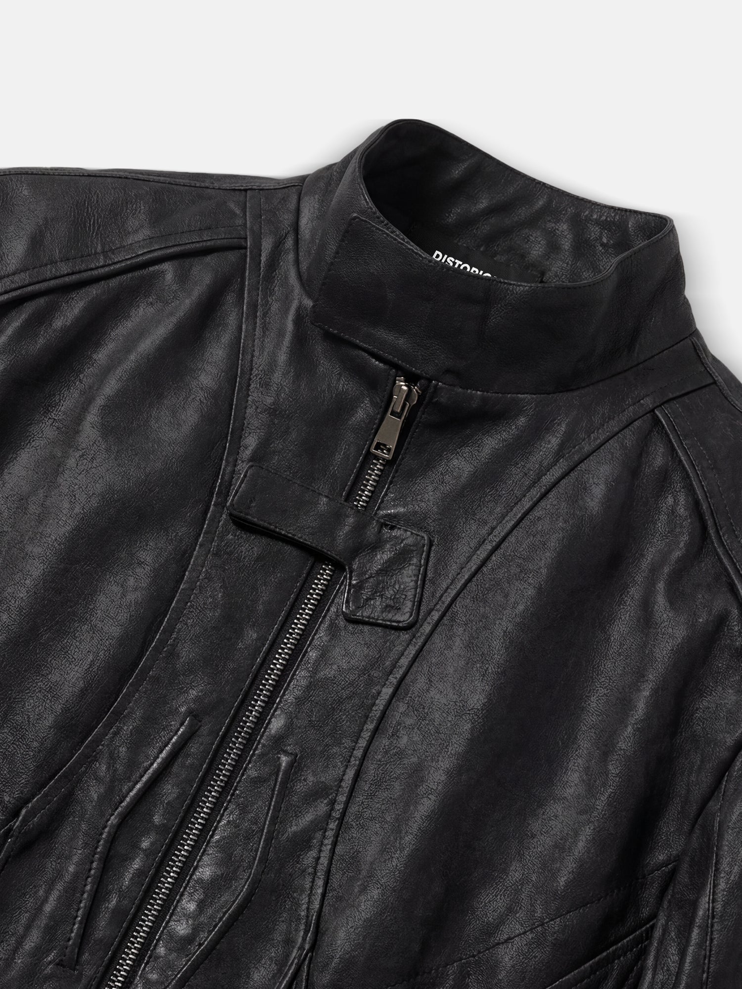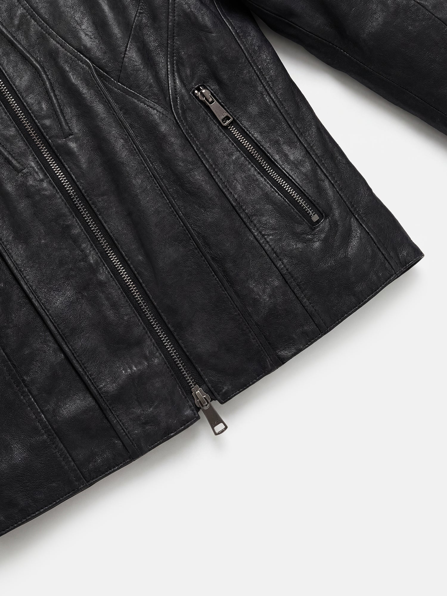 Esta chaqueta moto negra presenta paneles estructurados y detalles de cremalleras para un look elegante y versátil. Una pieza atemporal inspirada en el estilo biker, diseñada para un toque urbano.