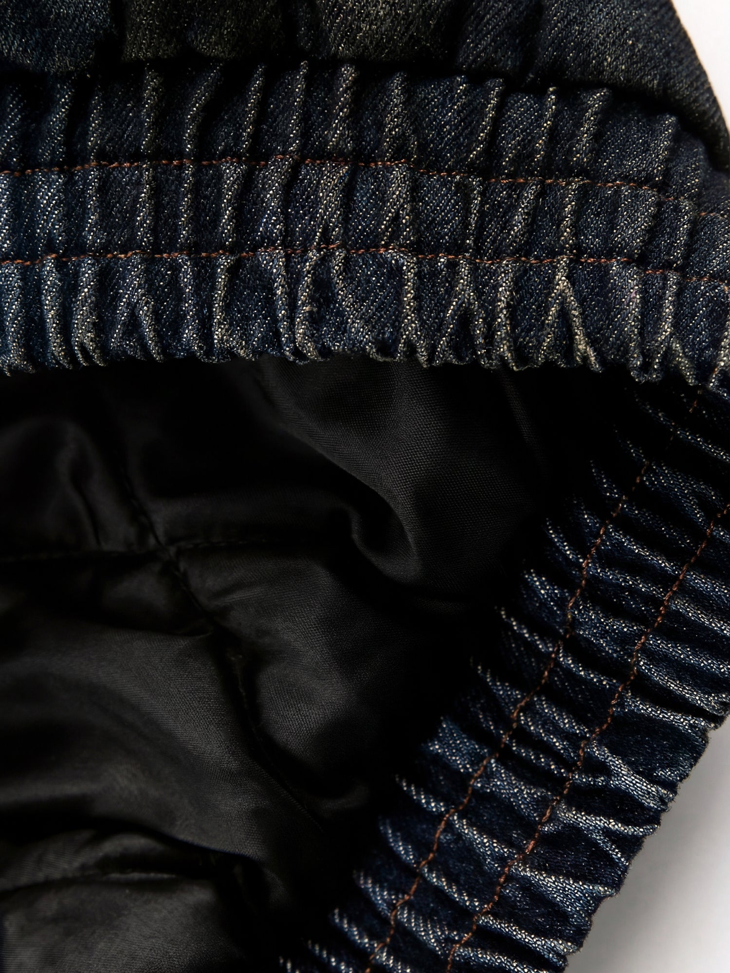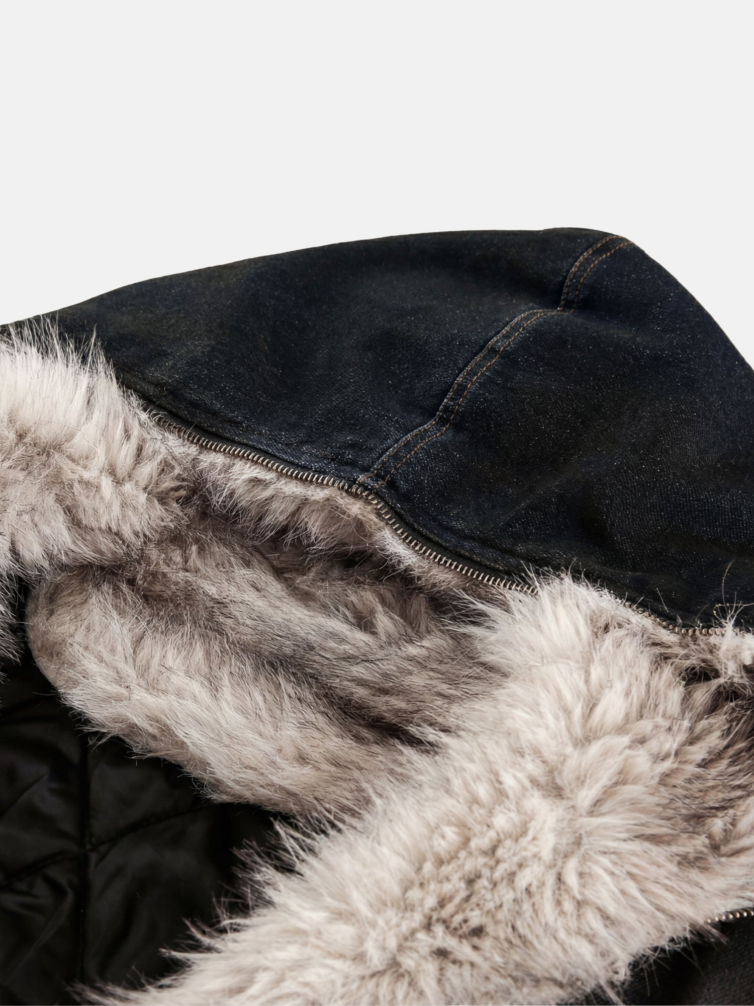 Con una carcasa de denim desgastado, forro de piel sintética ultra suave y detalles utilitarios terminados en un tono azul oscuro lavado.