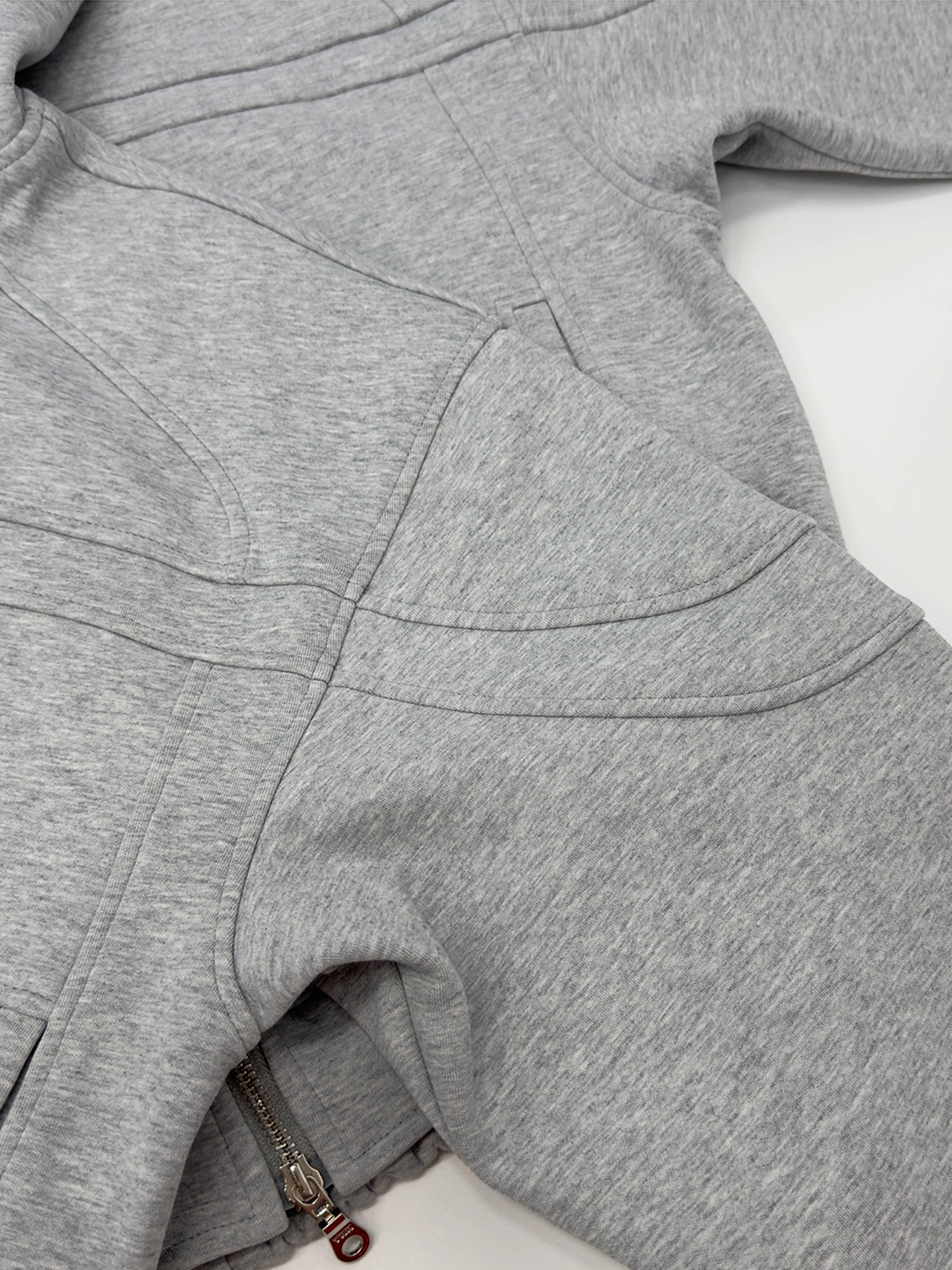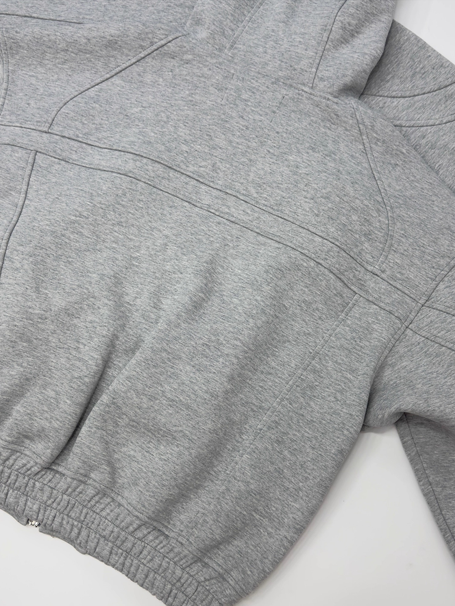 This structured grey full-zip hoodie combines minimalist design with a bold, sculptural silhouette. Built for both comfort and style, it features panel seam detailing, a snug hood, and elastic cuffs and hem for a refined fit.