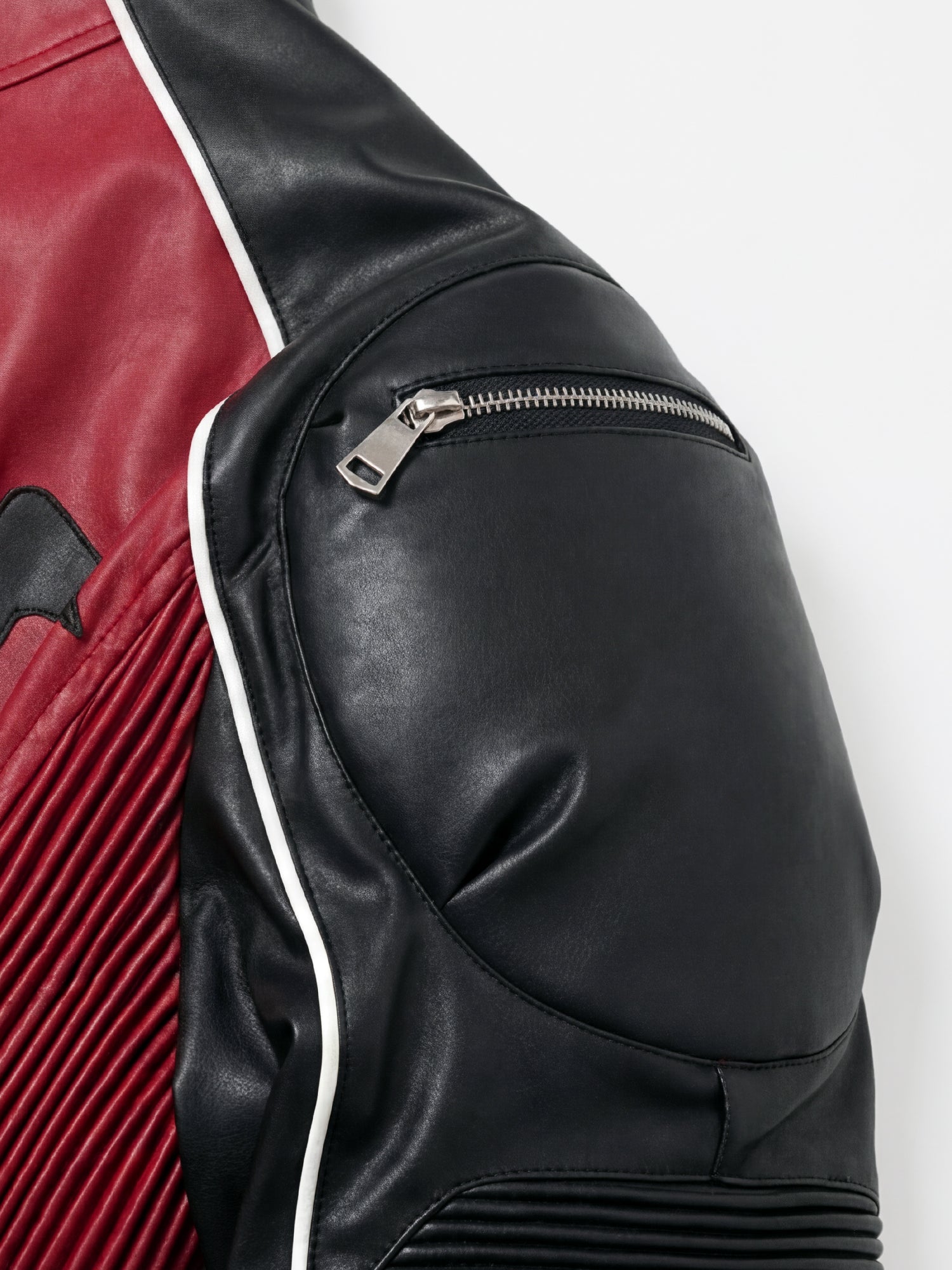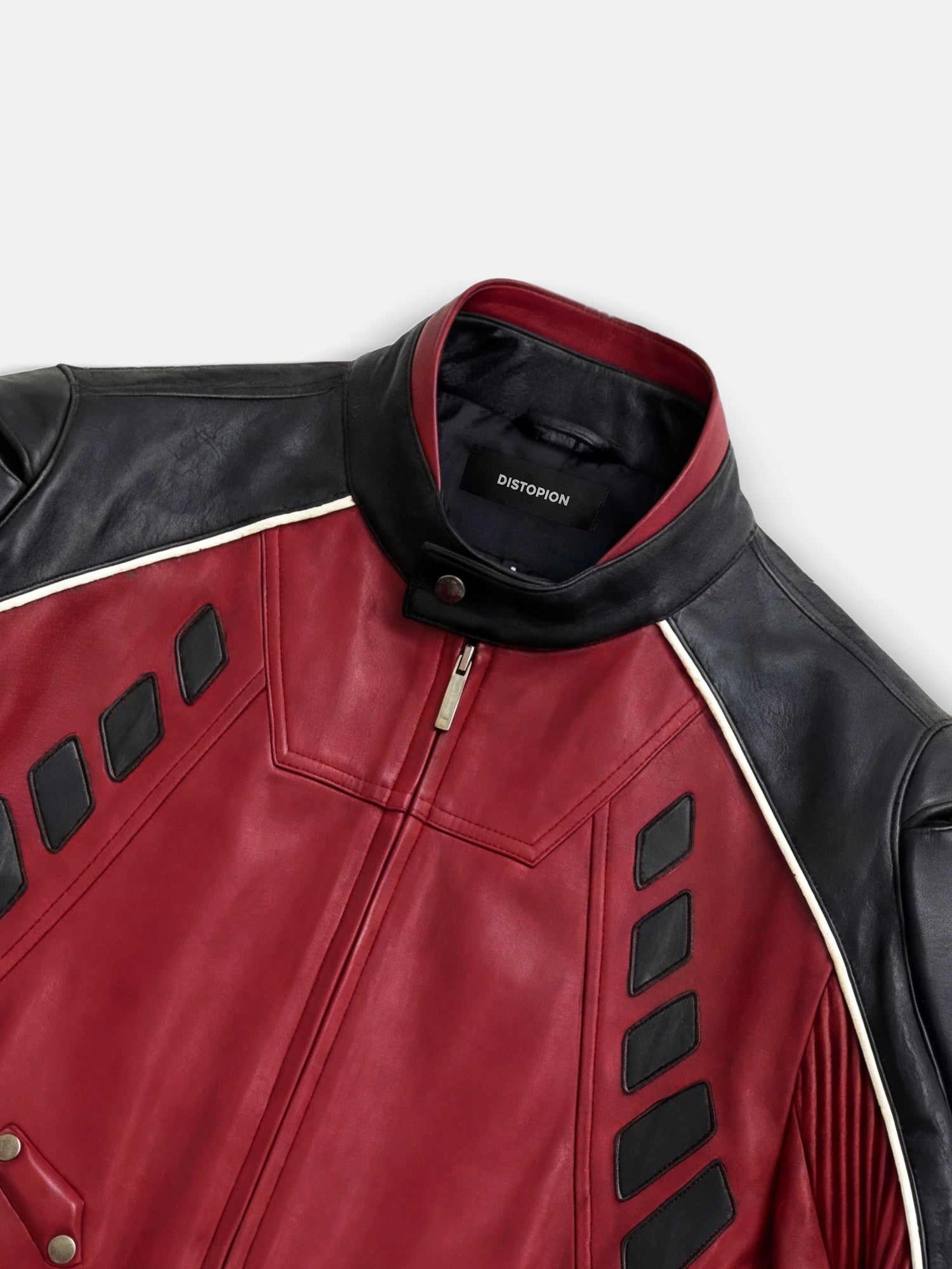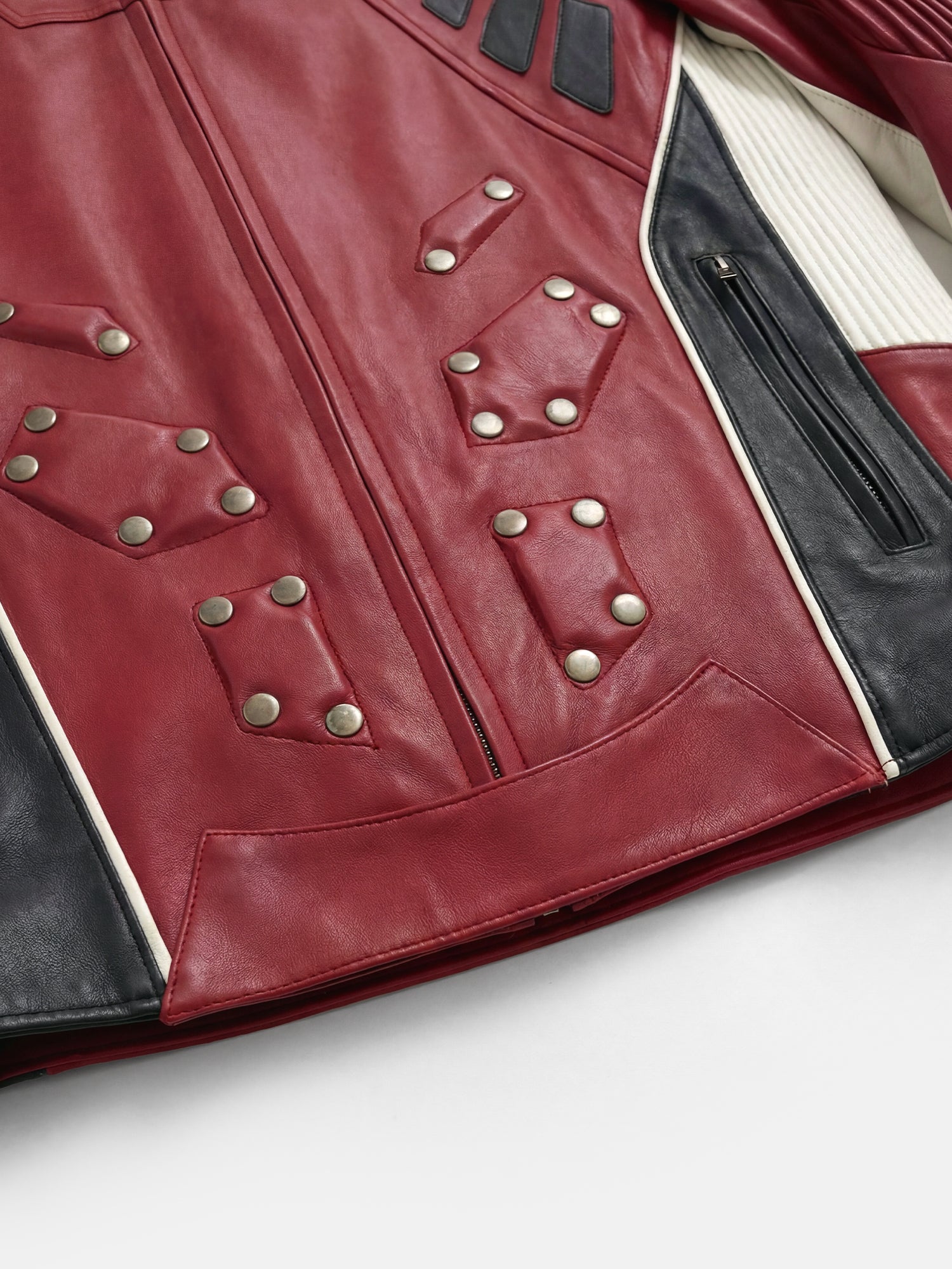Esta chaqueta moto roja y negra presenta paneles audaces, detalles con tachuelas y un diseño estructurado inspirado en las carreras. Una pieza destacada con un toque resistente.