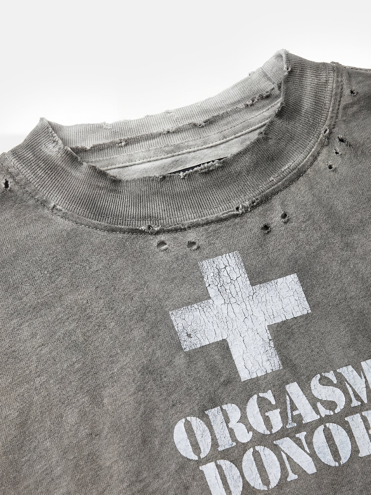 Camiseta corta con estampado audaz estilo plantilla y dobladillo sin rematar. Con una silueta cuadrada y detalles mínimos para un estilo industrial depurado.