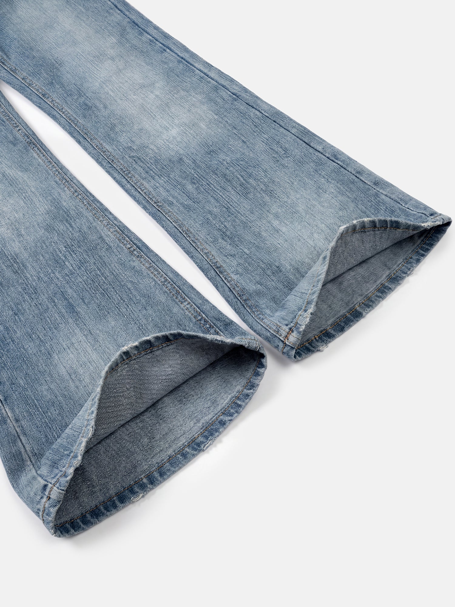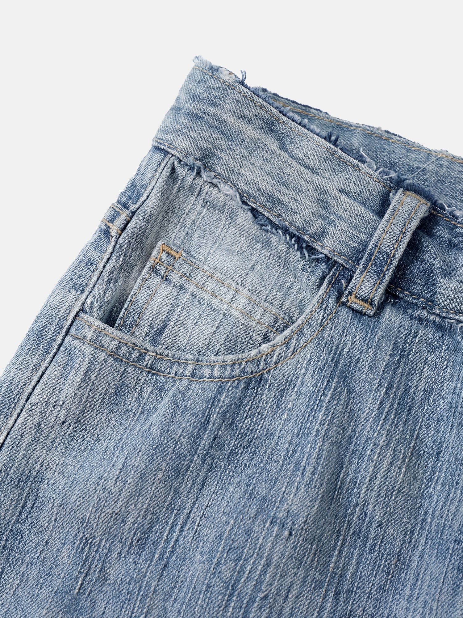 Denim stonewash chiaro dal taglio ampio e lungo per una vestibilità fluida. La cintura con bordo grezzo e la cucitura interna allungata creano un look a strati e pozzanghere.
