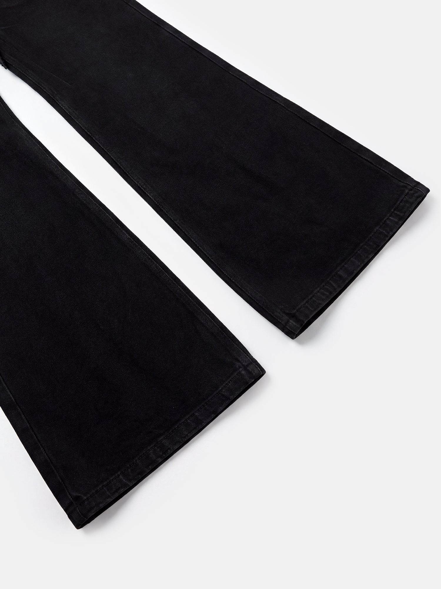 Denim completamente nero con patta sovrapposta in similpelle grezza, dal taglio ampio e lungo, così che le gambe si appiattiscano in uno stile malinconico, da motociclista notturno.