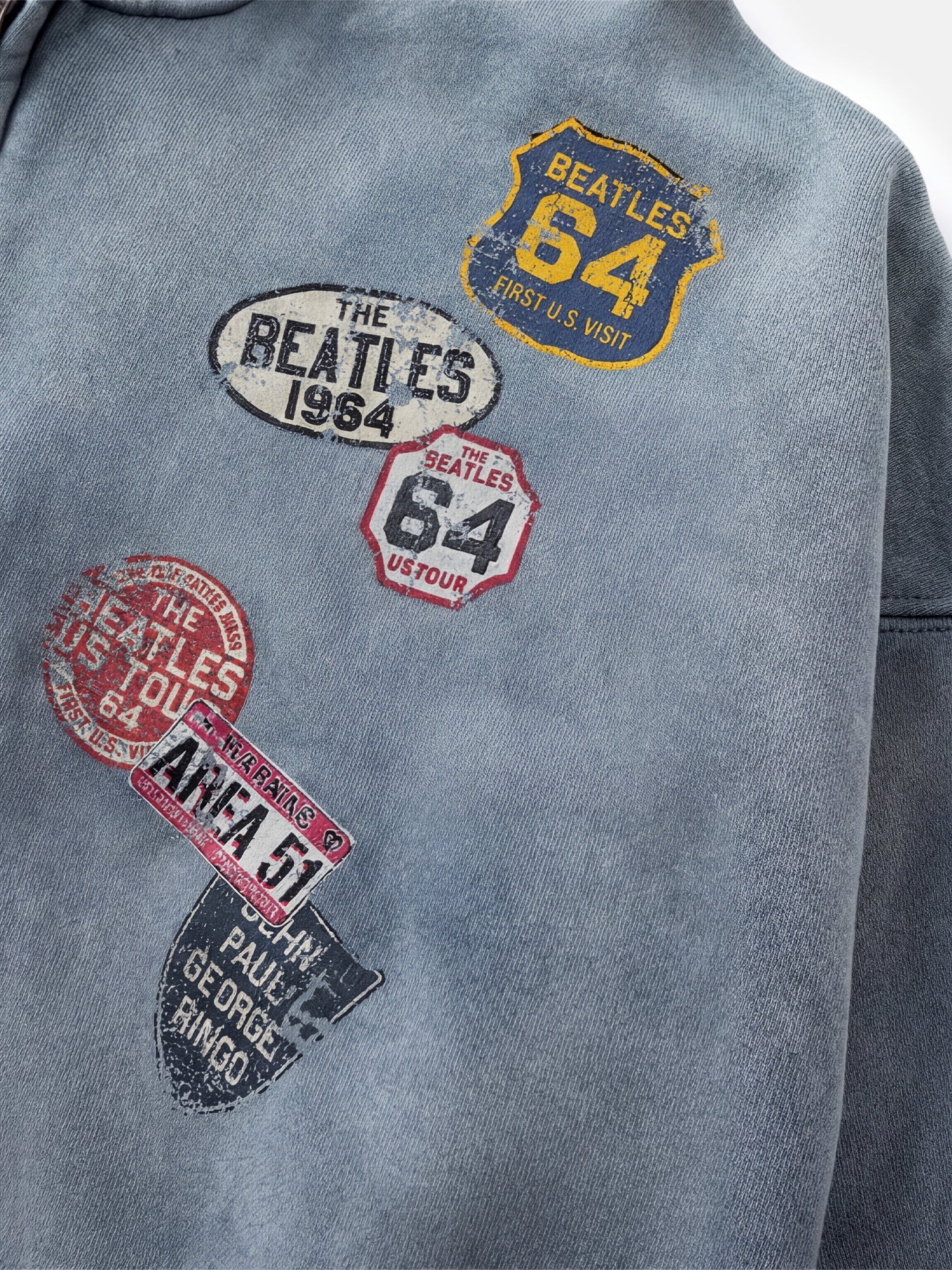 Questa felpa con cappuccio e zip blu slavato è decorata con toppe in stile retrò sul petto per un tocco casual e giocoso. Una vestibilità comoda, perfetta per l'uso quotidiano.