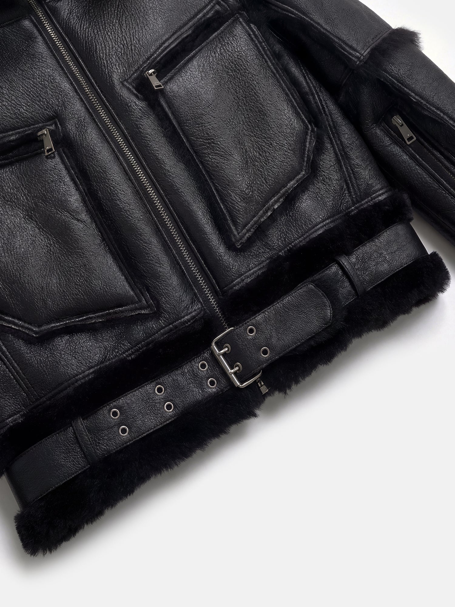 このブラックジャケットは、ファー裏地付きフードとレザーパネルのベルト付きウエストが特徴です。大胆なモトディテールを備えた、タフな寒冷地用必須アイテムです。