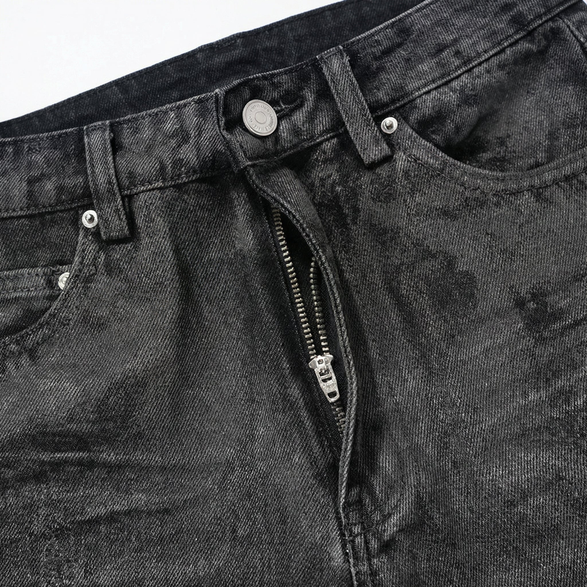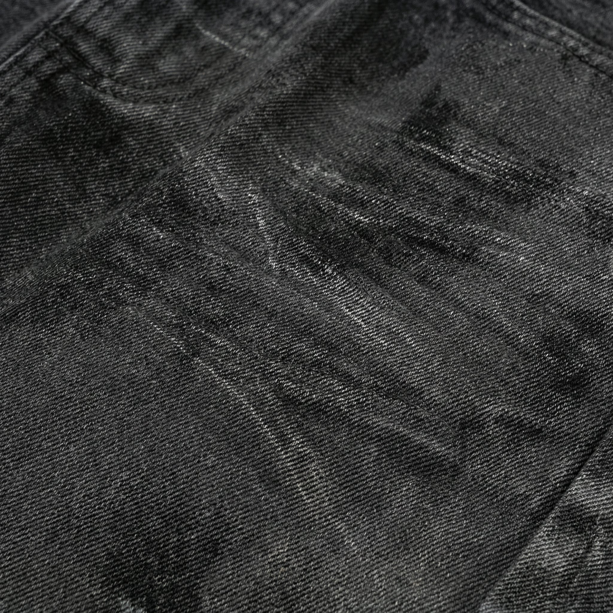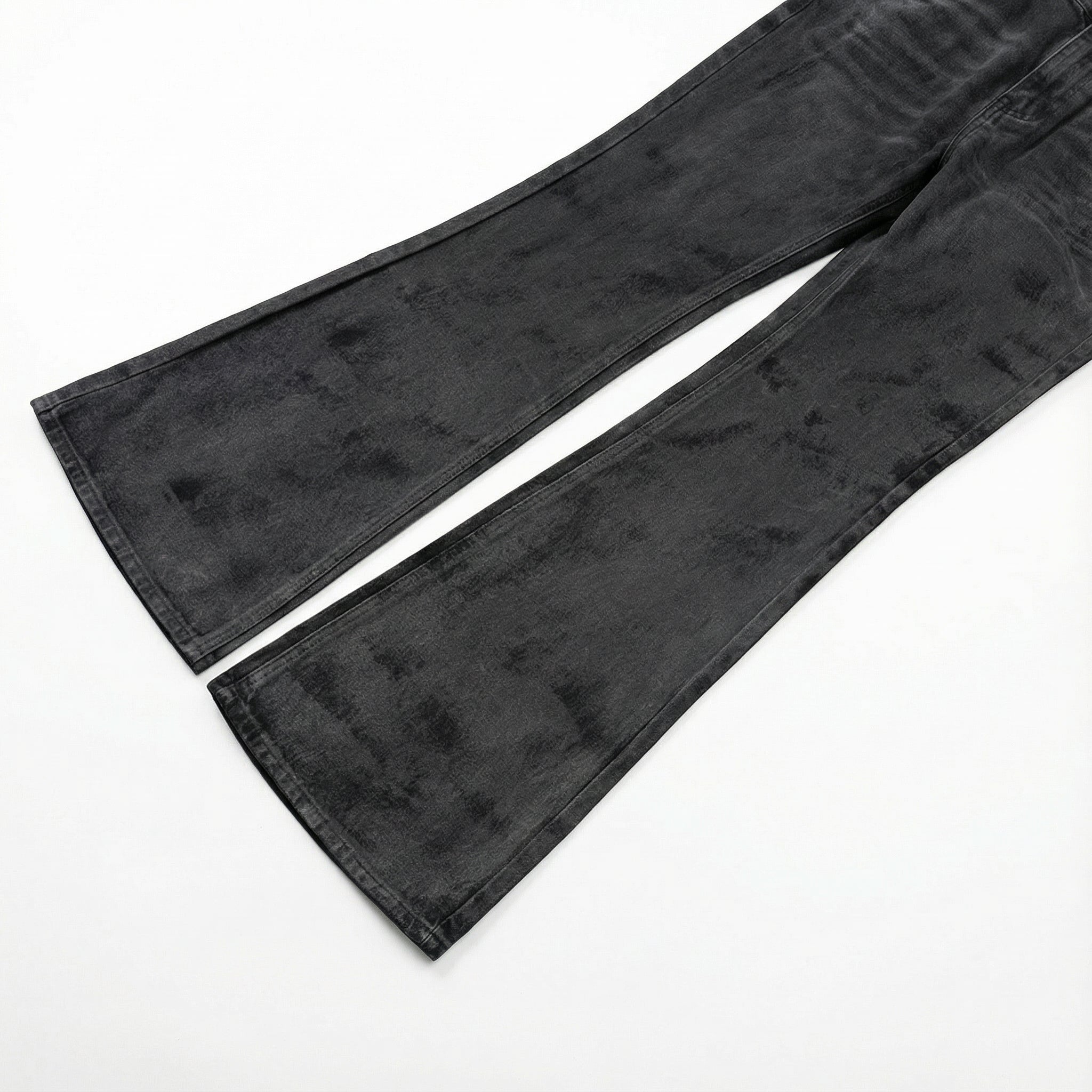 Wide-leg denim with a dark textured wash and a relaxed, stacked silhouette. The charcoal tone adds depth while keeping the look clean and minimal.