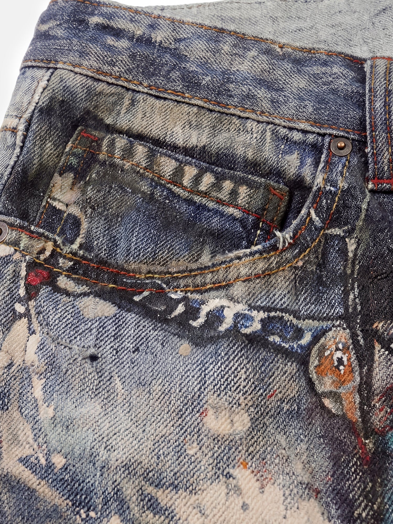 거친 스트리트웨어 분위기를 위한 체인과 열쇠 모티프가 있는 디스트레스드 데님.