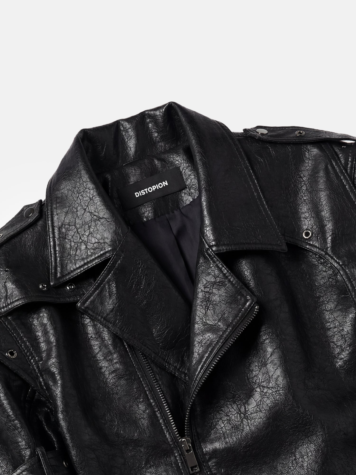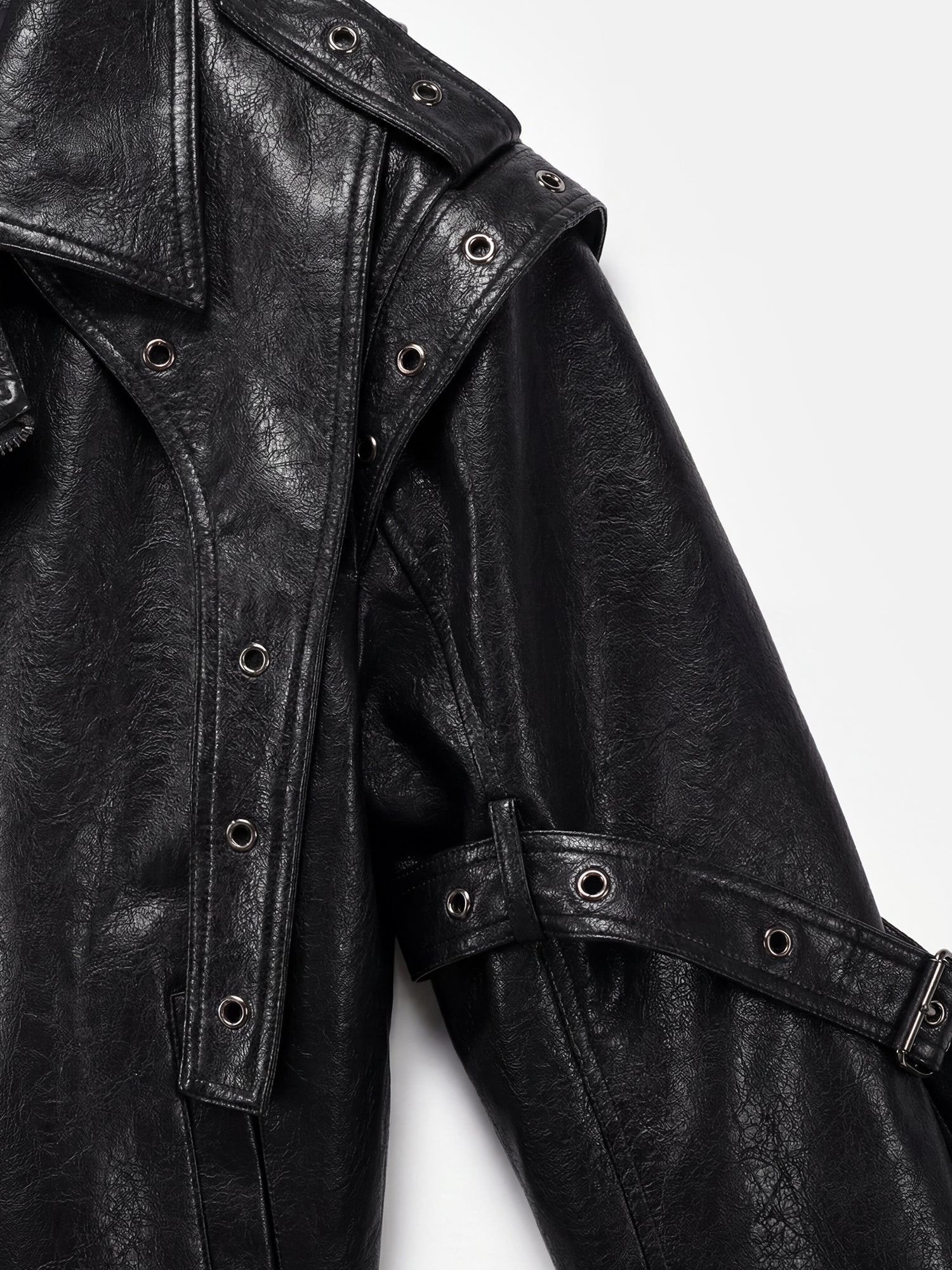 탈부착 가능한 스트랩과 비대칭 앞지퍼가 있는 분해된 바이커 재킷으로, 광택 있는 가죽 느낌의 원단에서 포스트펑크 스타일을 선사합니다.