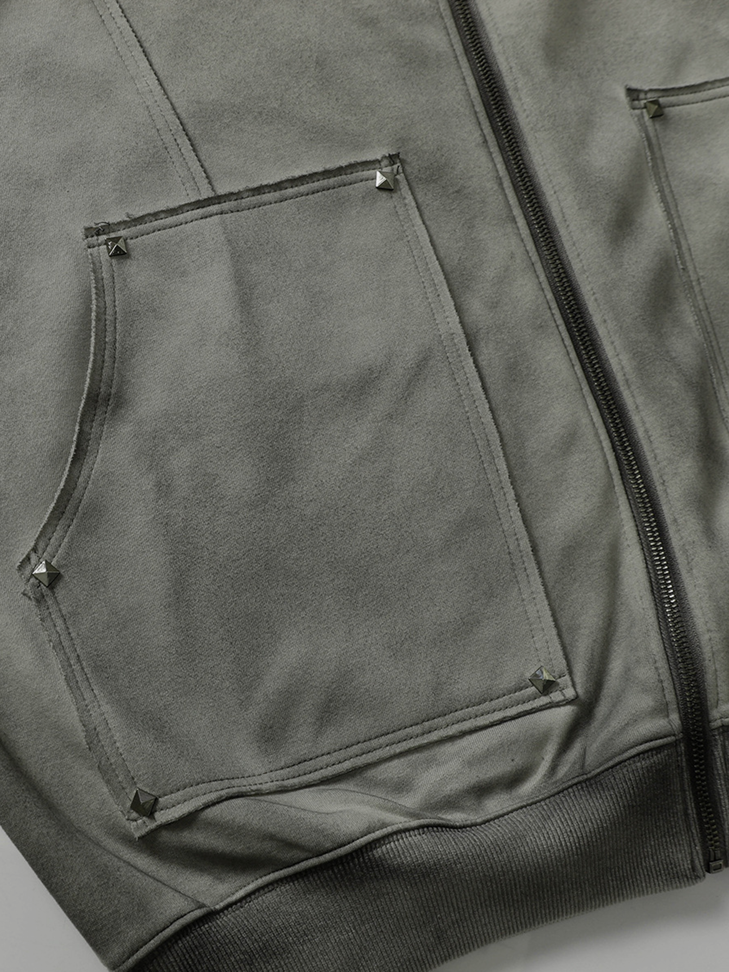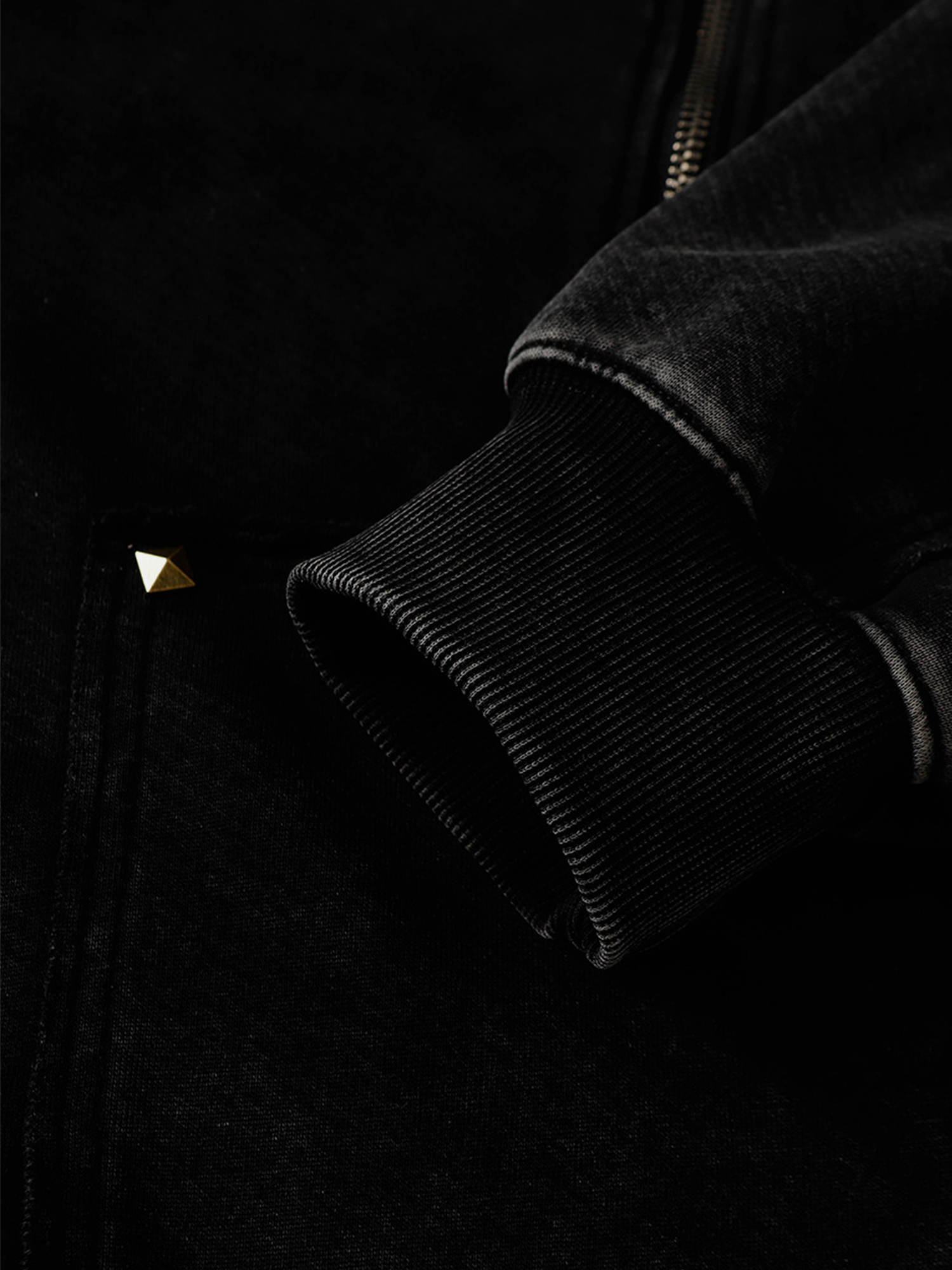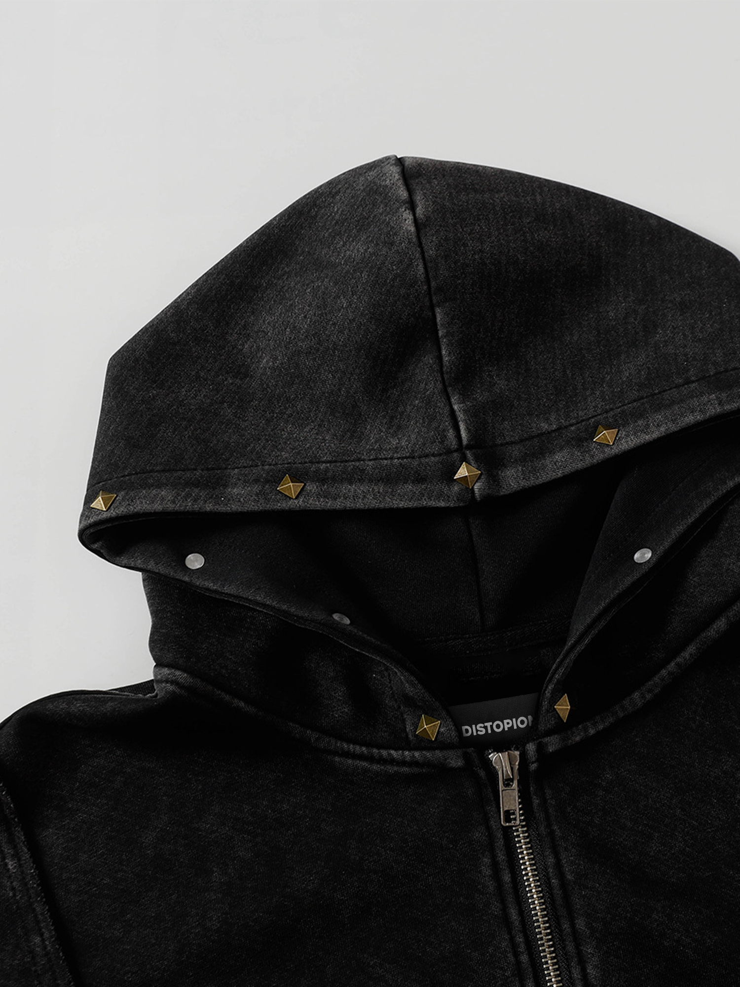 En vasket hettegenser med metallnappdetaljer og frontlommer, som kombinerer røffe detaljer med en avslappet streetwear-passform.