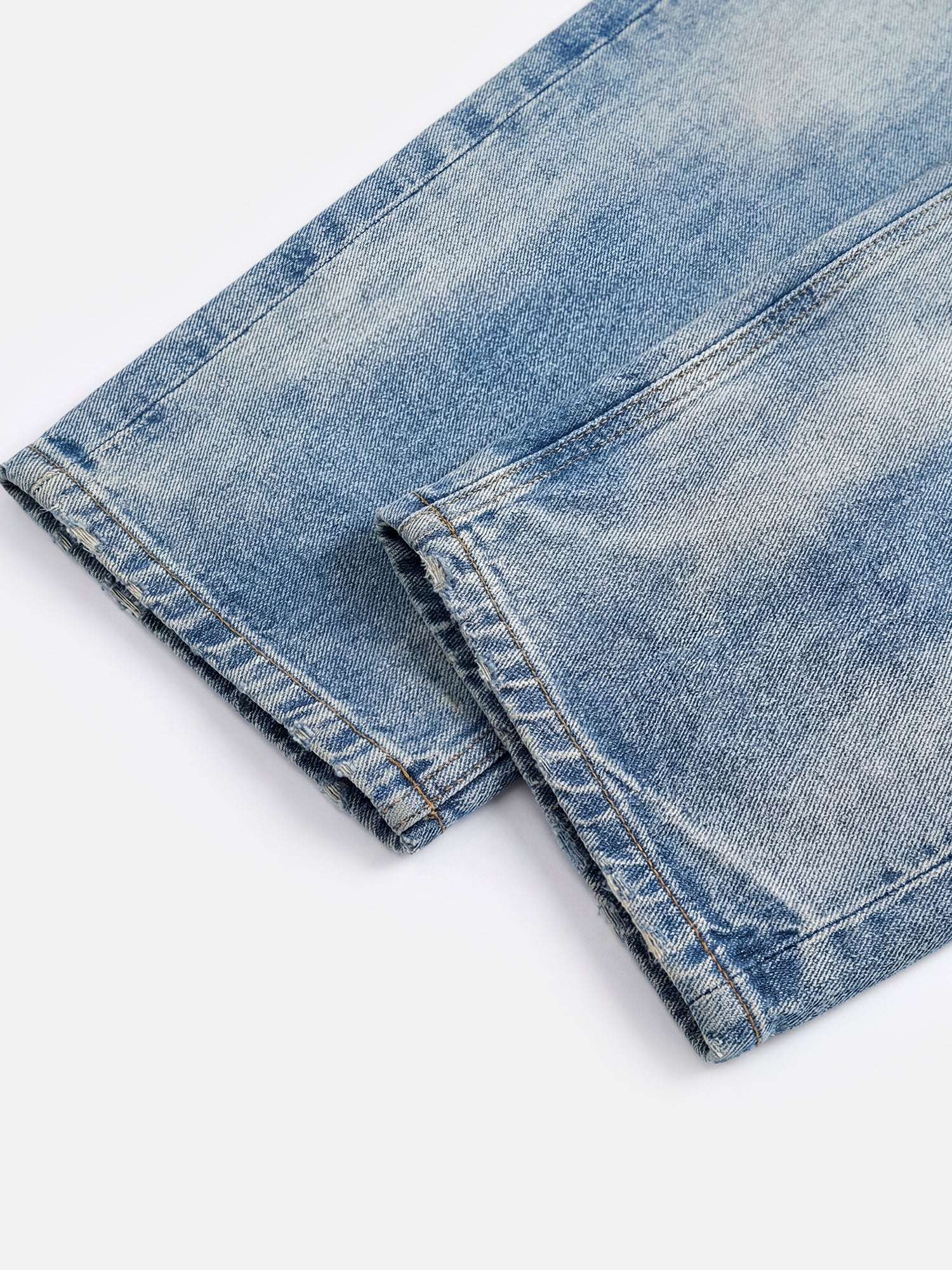 Luźne, niebieskie dżinsy o szerokim kroju, dzięki czemu nogawki swobodnie się układają i łatwo układają się na butach.