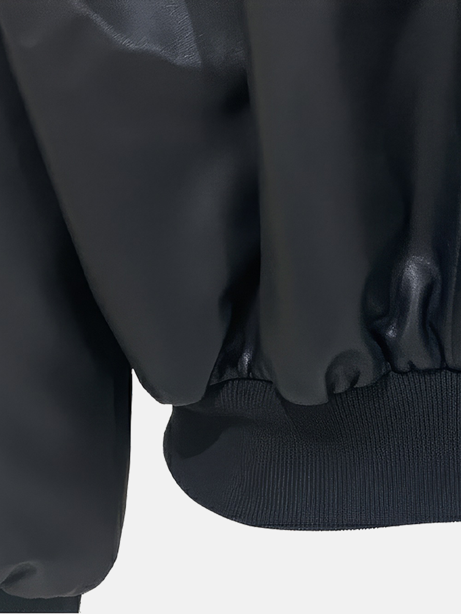 This black bomber jacket features a faux fur collar and utility pockets for a bold urban edge. A mix of warmth and streetwear style in one piece.