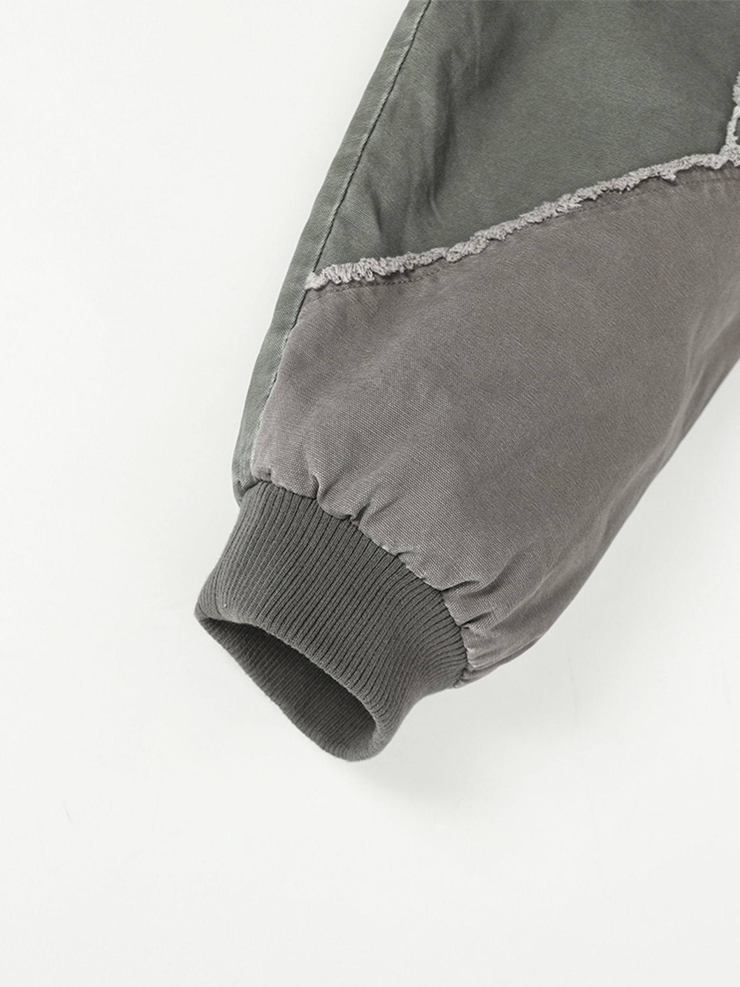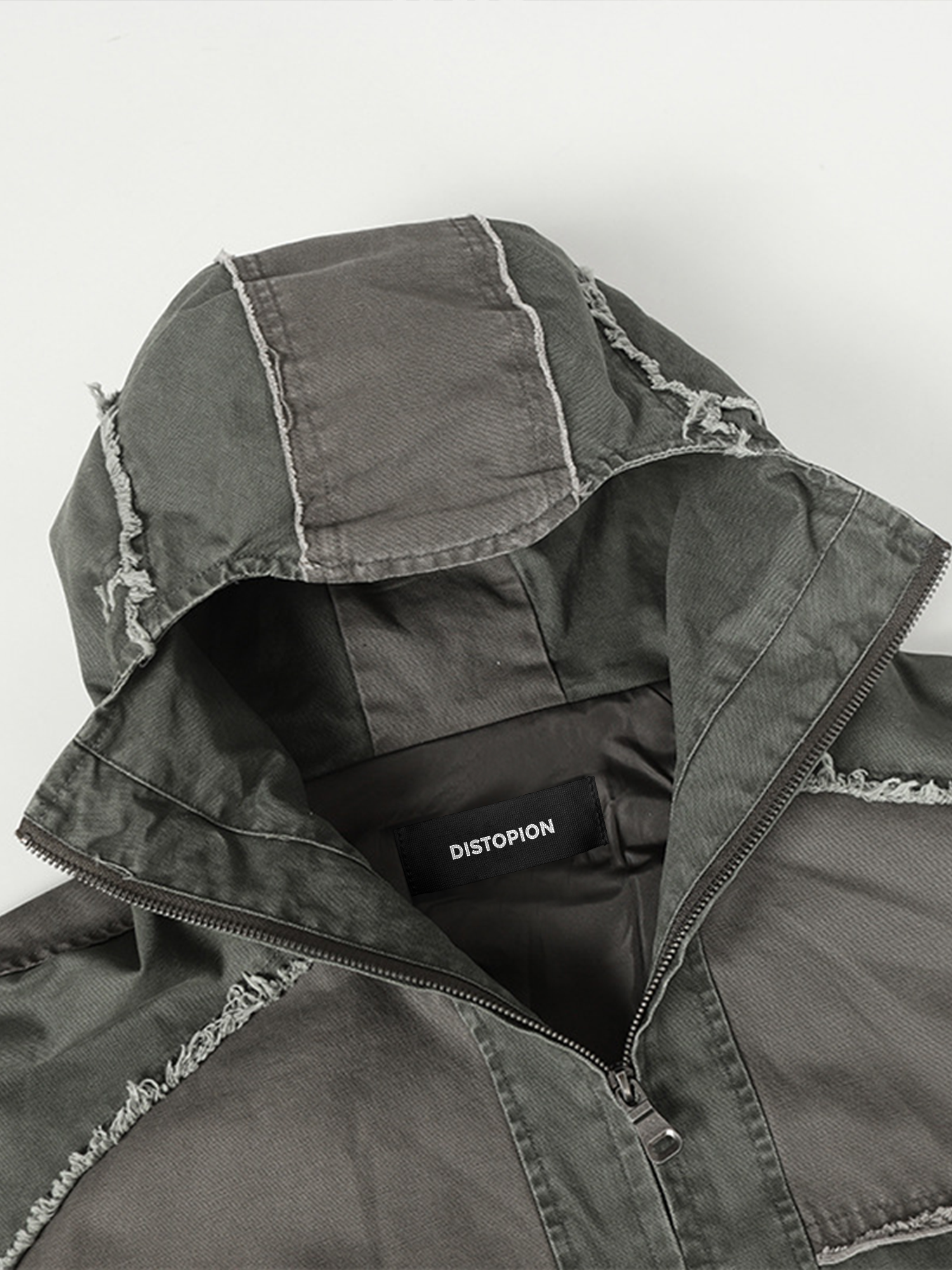 Această jachetă combină structura utilitară cu cusături destrămate și cusături pe panouri. Un strat streetwear deconstruit cu o estetică robustă.