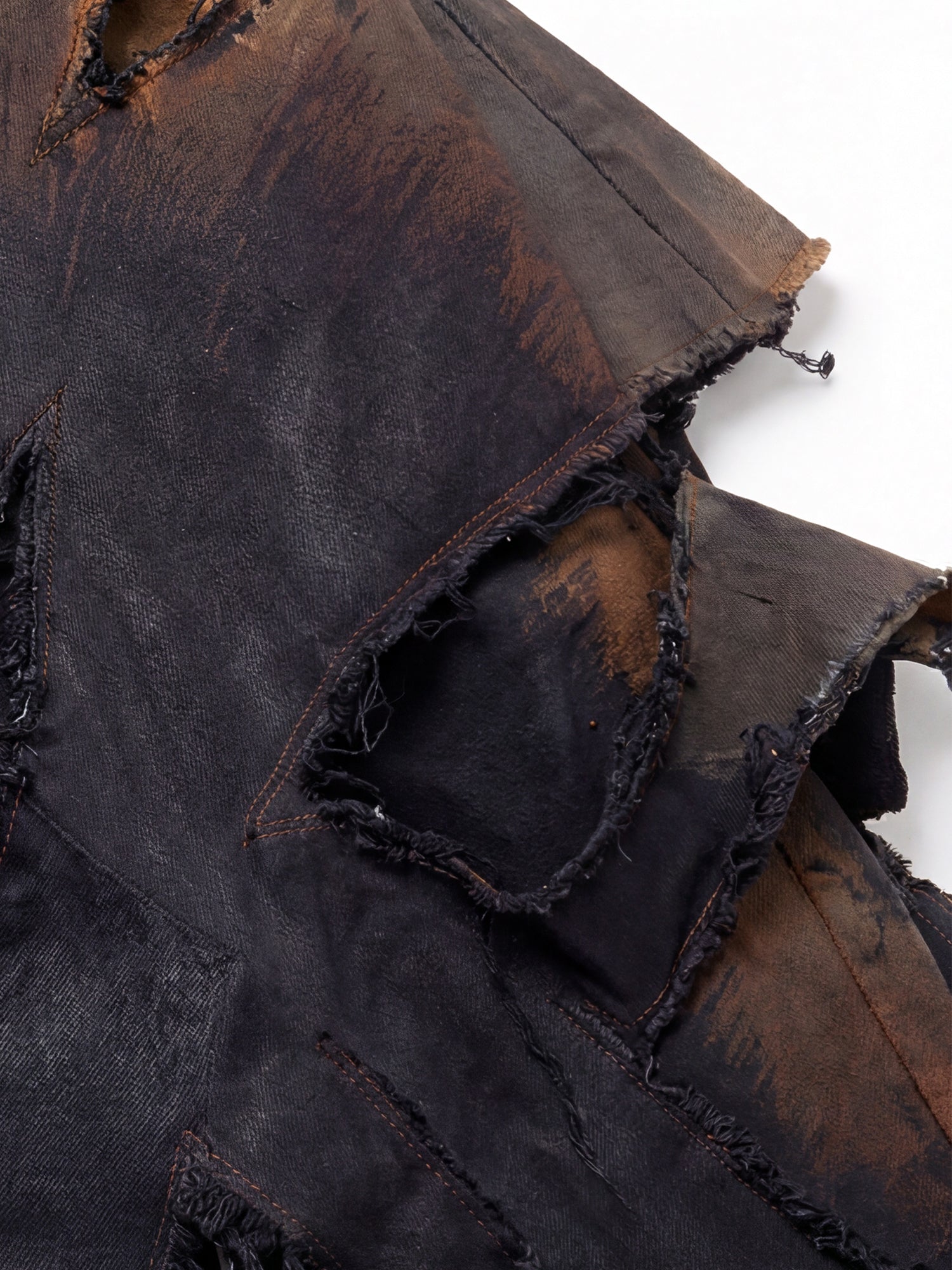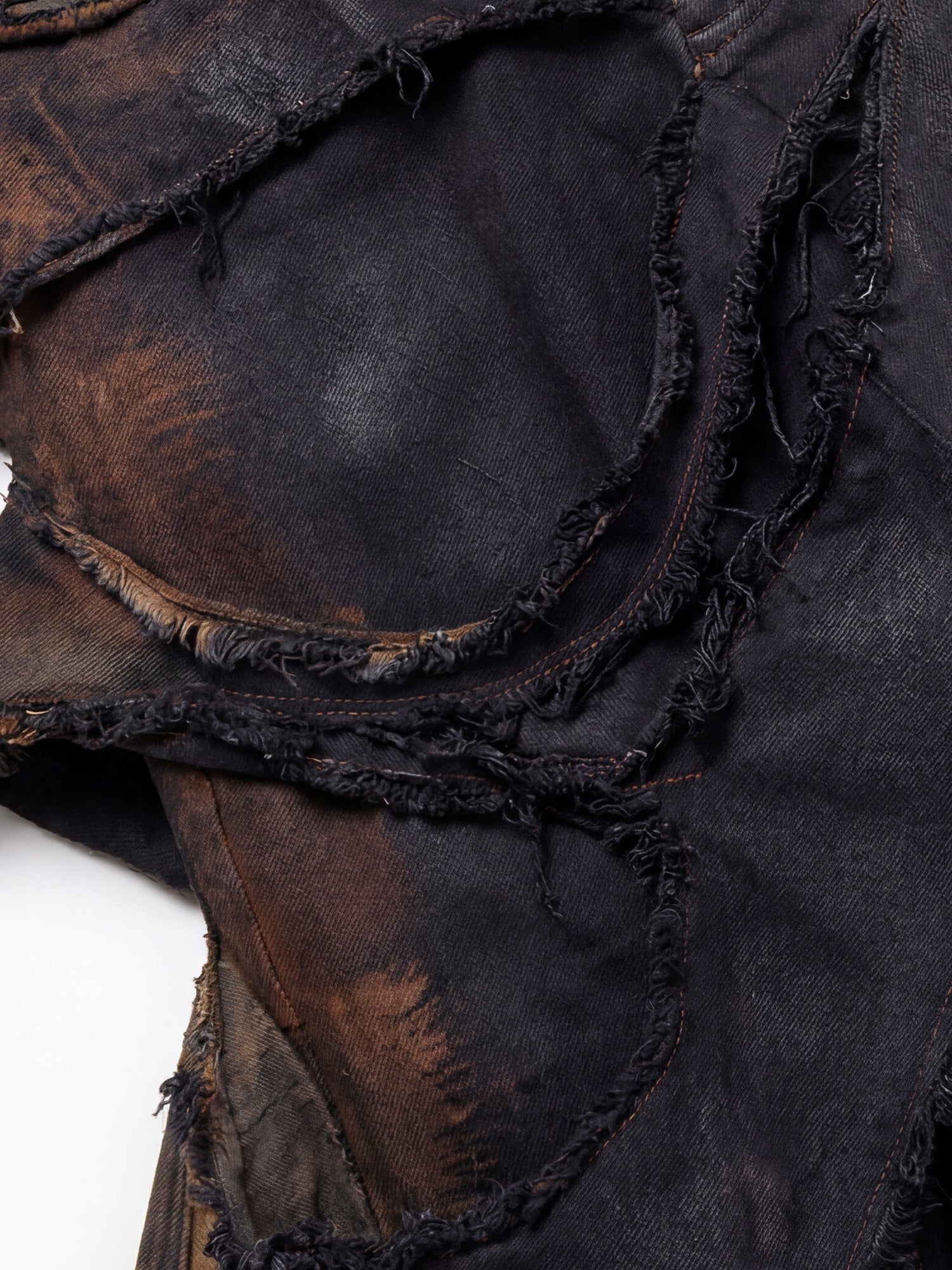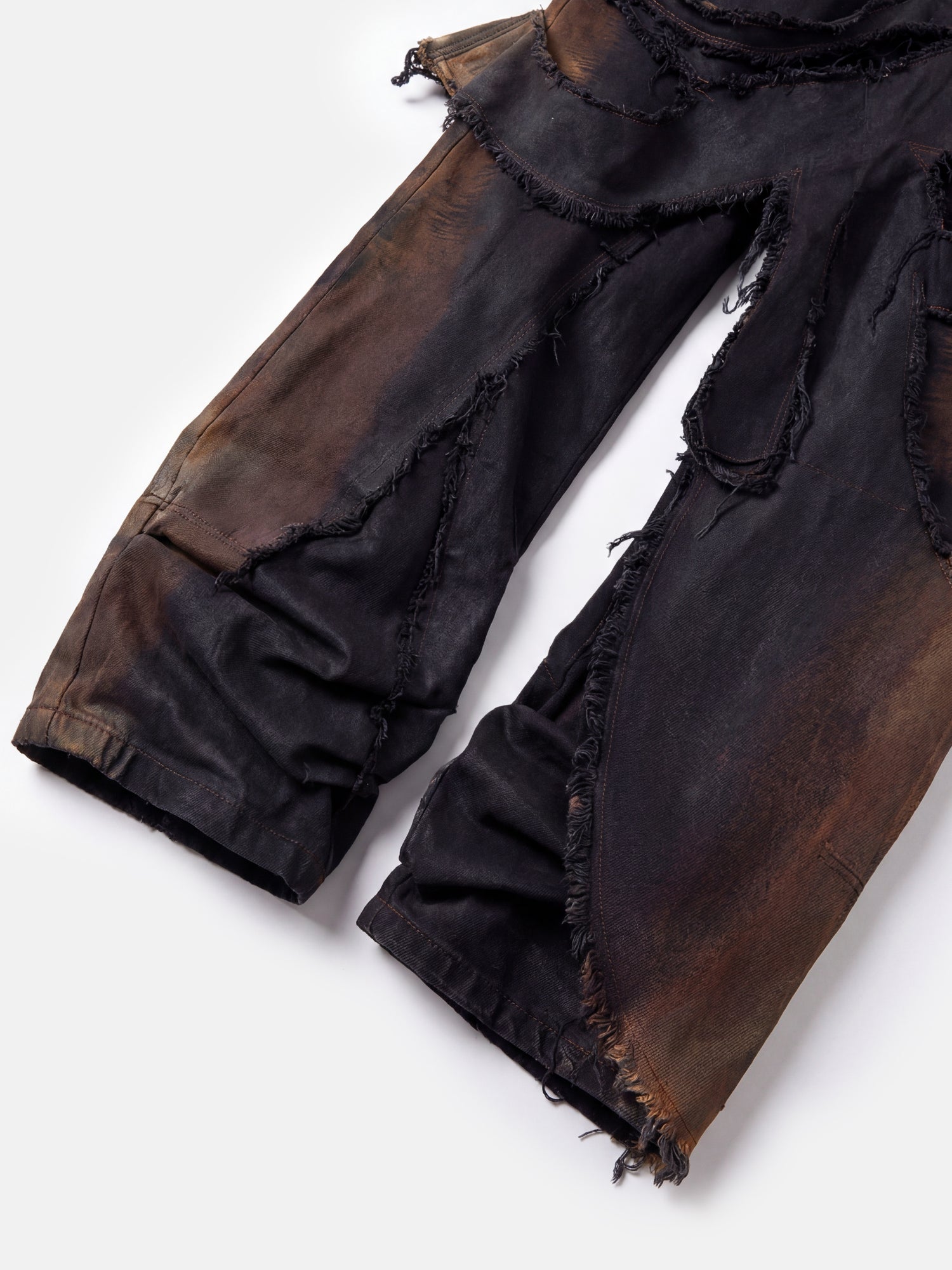 Născuți din ruine, acești pantaloni poartă cicatricile rebeliunii. Margini brute, straturi haotice și un suflet deconstruit.